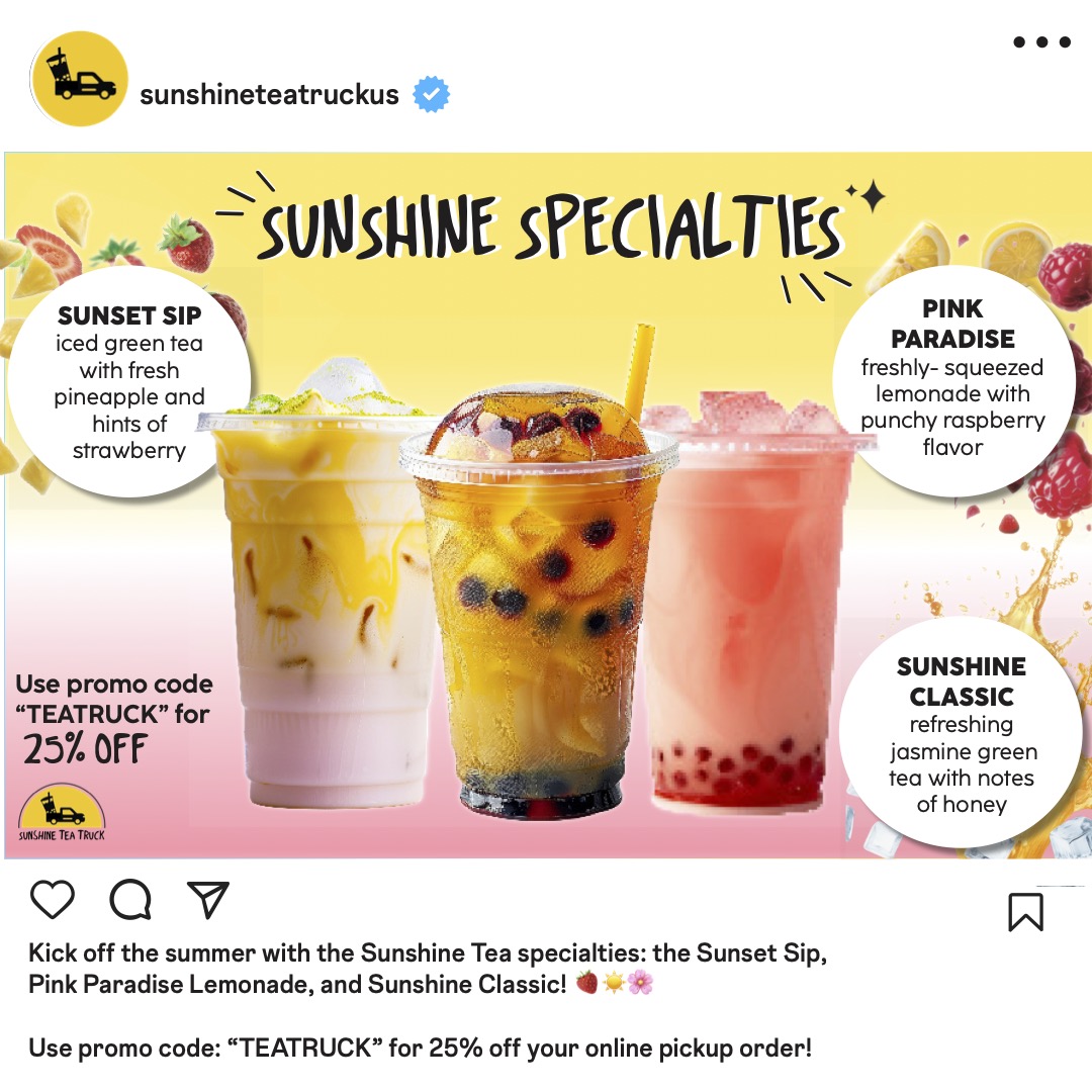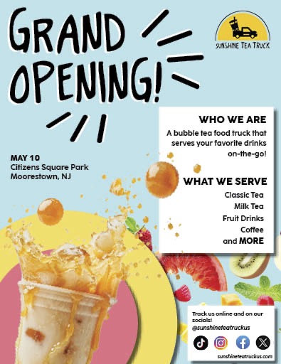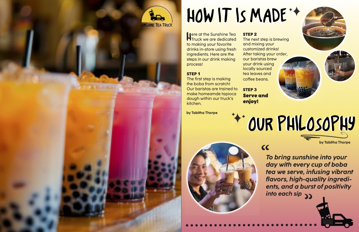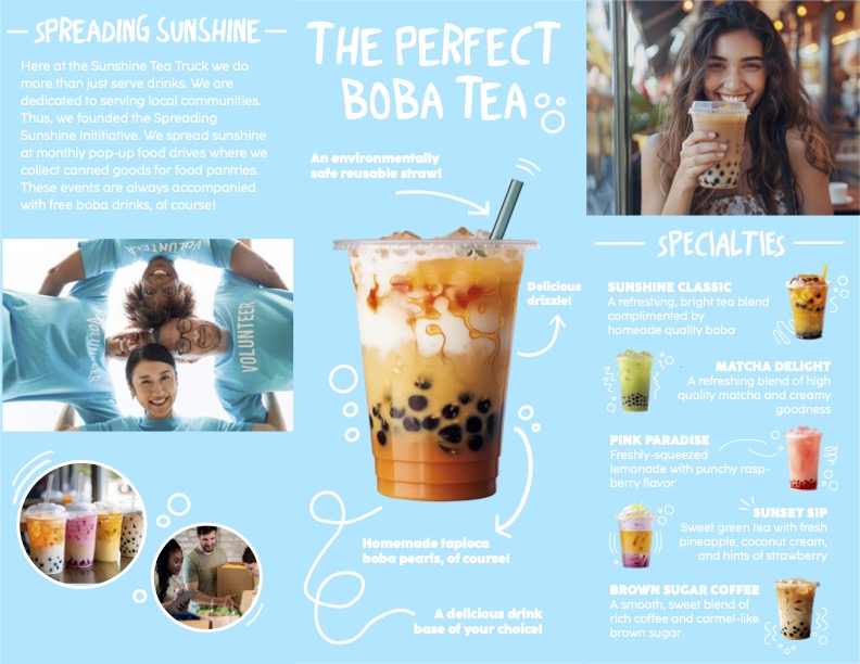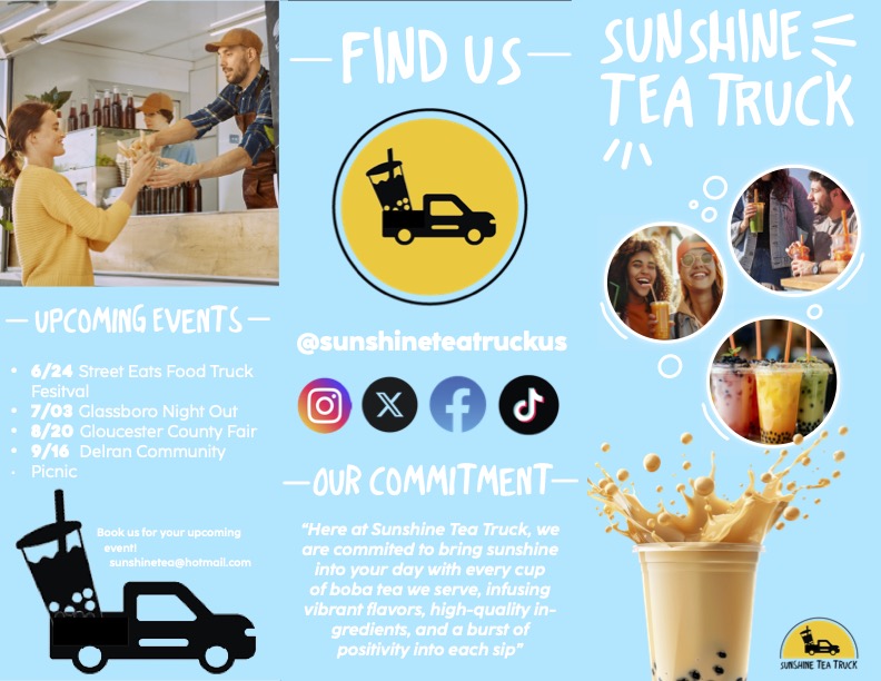 For a college course, I conceptualized “Sunshine Tea Truck,” a fictional mobile beverage business, and developed a comprehensive advertising campaign to introduce it to the public. This campaign included the creation of a logo, a grand opening flyer, a social media advertisement, a magazine spread, and a brochure, all designed to effectively communicate the brand identity and offerings of the Sunshine Tea Truck.